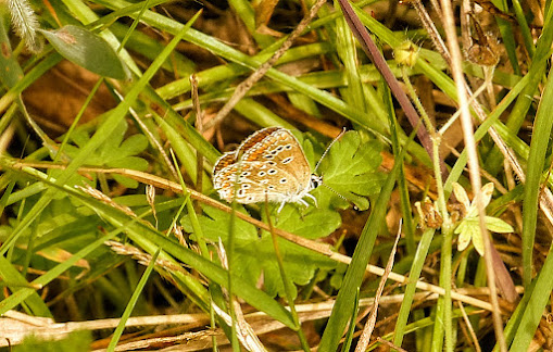 Of course, having Geoff along meant that the plants that we came across, we used Geoff's expertise in identifying the following: Spear and Creeping Thistle, Cats Ear, Smooth Hawksbeard, Ragwort (along with the caterpillars feeding on them, Cinnabar Moth), St. John's Wort, Vervain and Biting Stonecrop were all seen this afternoon. Butterflies this afternoon here at Woolmer Pond included a good number of Common Blue’s and after careful examination of my photos, at least one male Brown Argus was seen in the Cottage Garden. Other butterflies included Large and Small White, Red Admiral, Gatekeeper, Meadow Brown and a single Speckled Wood. Even a few moths got onto my day list that included a couple of Straw-barred Pearl and my first Straw Grass-veneer of the year. The Bracken here had really spread since the last time we were here and who knows what interesting things lurked within them and walking across the garden, good numbers of Common Field Grasshoppers took flight as we stepped across the short grass.